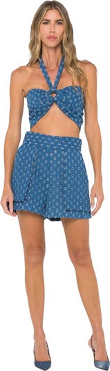 Denim halter bra top in 100% cotton featuring ring detail, back zip, and adjustable tie. A chic summer essential handmade by JBQ.