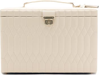 The embodiment of sophistication and style. The Caroline Extra Large Jewelry Case, a timeless classic with elegant soft lines of the 50’s, supple diamond quilted leather accented with gold hardware. This refined case is the perfect home for your precious jewelry and heirlooms.