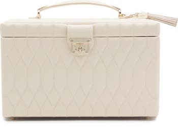 The embodiment of sophistication and style. The Caroline Large Jewelry Case, a timeless classic with elegant soft lines of the 50’s, supple diamond quilted leather accented with gold hardware. This refined case is the perfect home for your precious jewelry and heirlooms.