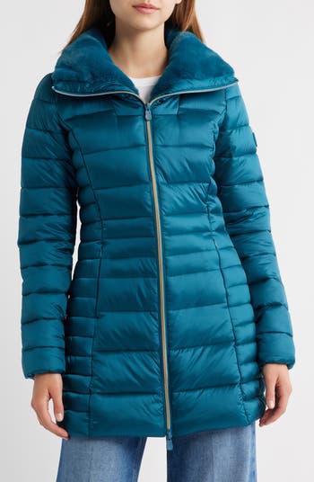 A shiny satin finish brings a bit of glamour to your cold-weather rotation in this streamlined puffer jacket upgraded in a longer silhouette that softly nips in at the waist. Plush faux-fur lining completes the cozy-luxe vibe.