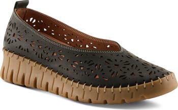 Lasercut details provide a lively update for this low wedge pump complete with a comfort-cushioned footbed.