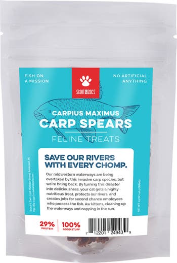 CAT TREATS: CARP SPEARS - Kitties love carp! And they’ll totally fall head over paws for our Carp Spears. Smoked USA carp fresh from the waterways of Kentucky, these spears are just what every cool cat dreams of while napping in the sunshine. Treat your feline friend to the irresistible taste of Carp Spears! PROTEIN SOURCE: Made from 100% wild-caught Asian carp—an invasive species turned sustainable protein powerhouse—these treats use limited human-grade ingredients to offer clean, responsible nutrition. CRUNCHY TEXTURE: With a light, crispy bite that satisfies natural chewing instincts, Carp Spears help promote better oral health while keeping cats mentally stimulated and coming back for more. LIMITED-INGREDIENT: Crafted with absolutely no fillers or additives, these simple, fish-forward snacks deliver pure, ocean-fresh flavor that even picky cats will love—and pet parents can trust. Naturally high in omega-3 fatty acids, they support your cat’s shiny coat, healthy skin, joint function, and overall vitality with every bite. RESPONSIBLY SOURCED & MADE: Made in the USA with ethically sourced fish, Carp Spears are free from heavy metals, mercury, preservatives, and fillers—just safe, wholesome goodness in every piece. Choose Scout & Zoe’s Carp Spears for a treat that’s simple, safe, and satisfying.