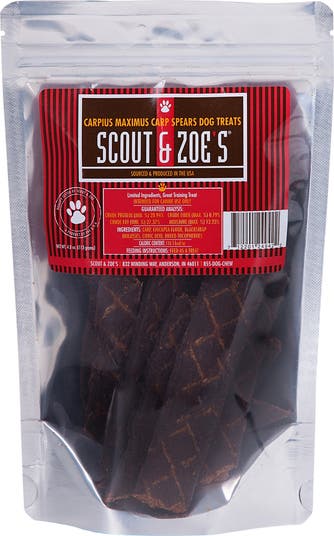 DOG JERKY: CARP SPEARS - Scout & Zoe's Carp Spears Dog Treats offer a truly unique and healthy snacking experience for your dog. Sourced from wild-caught carp in the USA, these smoked jerky strips provide a chewy, satisfying treat packed with flavor and functional benefits. LIMITED-INGREDIENT: Crafted with absolutely no fillers or additives. Naturally rich in Omega-3 fatty acids, Carp Spears support your dog's skin, coat, and heart health while delivering a clean, ocean-fresh flavor that dogs absolutely love. Free from heavy metals, mercury, artificial additives, and preservatives, these fish treats are a safe choice for dogs with food sensitivities or digestive issues. They're also grain free, low in fat, and provide a healthy alternative to overprocessed pet chews. Whether you're rewarding good behavior or simply treating your pup to something special, these nutritious spears deliver both taste and purpose. SMOKED CHEW: Each chew is gently smoked to preserve essential nutrients and enhance flavor, offering a natural way to elevate your dog's treat routine. The chewy texture encourages engagement and enjoyment, making them perfect for dogs who enjoy seafood and need a break from traditional meat-based treats. Ideal for all life stages, including puppies, adults, and seniors, Scout & Zoe's Carp Spears fit easily into your dog's regular diet as a protein-rich reward or supplemental snack. Choose Scout & Zoe's Carp Spears for a fish-forward treat that is simple, safe, and satisfying. Elevate your dog's treat game with our Carp Spears! Free from heavy metals and mercury, they offer a safe and nutritious option for your pet.