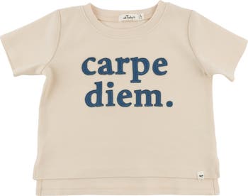 Seize the day in style with this laid-back tee! Featuring a charming "carpe diem." applique, this raw edge short sleeve shirt brings an effortless, cool-kid vibe to any outfit. Crafted in natural tones, it's perfect for everyday adventures—whether your little one is heading to school, the park, or just hanging out. Available in infant, toddler and boys sizes. Designed in Minnesota.