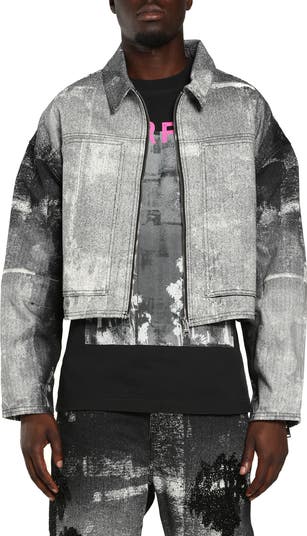 Inky black-and-white palm graphics channel the breezy spirit of the City of Angels in this boxy denim jacket embellished with light-catching beads.