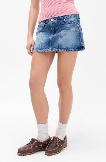 The wardrobe workhorse of Y2K makes a contemporary reappearance with this carpenter denim miniskirt boasting a indigo wash faded and whiskered to old-favorite perfection.
