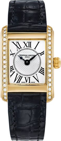 A rectangular case creates a sleek silhouette for a Swiss-made watch featuring lines of diamonds and Roman-numeral indexes.