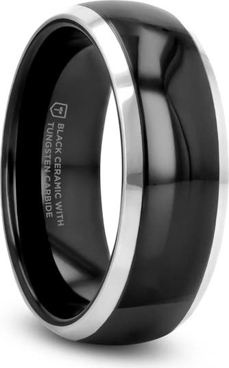 The Carrera Domed Black Ceramic and Tungsten Wedding Band offers a bold and contemporary look with its reflective black ceramic center and contrasting silver tungsten beveled edges. Perfect for couples seeking a matching set, this ring combines style with durability.