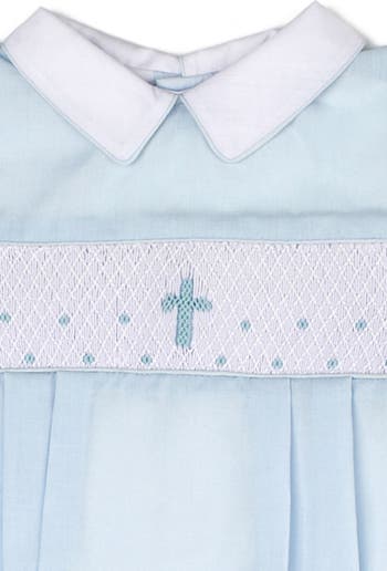 An embroidered cross accents the hand-smocked yoke of a sweet christening bodysuit that's sure to be a treasured keepsake.
