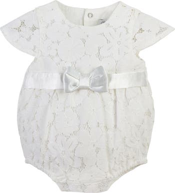A satin sash centered with a sweet bow adds a charming flourish to this keepsake christening bodysuit fashioned from delicate lace.