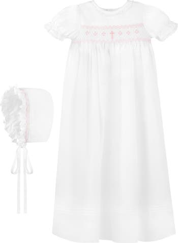 An embroidered cross and dainty blossoms accent the hand-smocked yoke of a cotton christening gown finished with lace trim and crisp pintucks. A coordinating bonnet completes the traditional look.