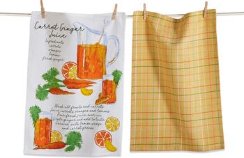 Meet our kitchen MVP and cherished customer favorite! Known for exceptional absorbency, durability, and elevated style, our beloved dishtowels have been a core product of tag since 1975. A great ginger carrot juice dishtowel set, perfect for the season and everyday. Set includes 1 hand screen printed satin weave, 1 woven check. Excellent for gifting or as additions to your kitchen household cleaning essentials. 100% cotton, making them extra absorbent for drying dishes. machine wash cold separately, tumble dry low