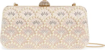 Glittering crystal embellishments and faux-pearl scallops highlight the art deco inspiration of this structured clutch kissed with lustrous silk.