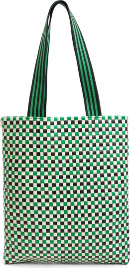 Finely woven leather creates a checkerboard aesthetic on a spacious tote suspended from a pair of webbing shoulder straps for comfortable wear.