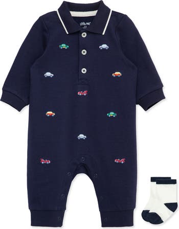 Colorful cars zoom across this soft cotton-blend romper framed by a tipped polo collar and bottom snaps that allow for easy changes. Coordinating socks help keep your little one's feet cozy.