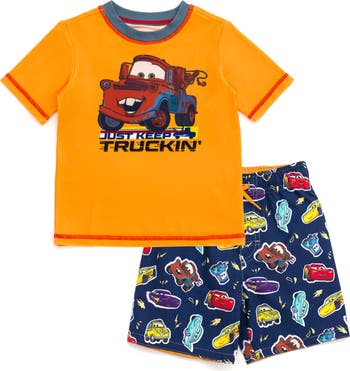 On your mark, get set, go! Race off to Radiator Springs in this Disney Pixar Cars Rash Guard and Swim Trunks Outfit Set to explore the iconic Route 66 town. Visit Mater at Tow Mater Towing & Salvage, hang out with Sally at the Cozy Cone Motel, hit the race track with the legendary Lightning McQueen, and fill up the gas tank at Flo's V-8 Cafe. Your little speedster will love this Disney Pixar Cars Lightning McQueen Rash Guard and Swim Trunks Outfit Set featuring their favorite animated movie characters!