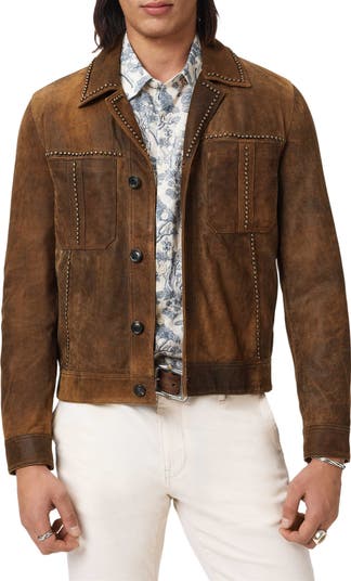 Burnished studs trace the swagger of a rugged jacket made from genuine suede.