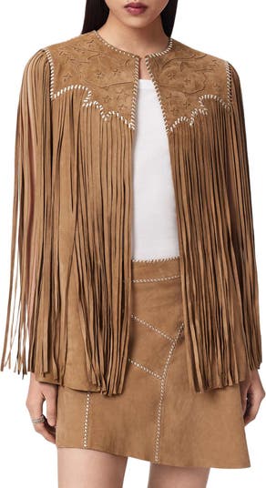 Dramatic fringe trim, cutout details and contrast whipstitching amplify the modern Western attitude of this outfit-making vest.