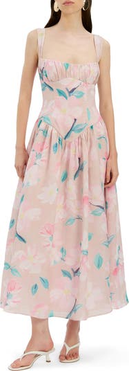 Painterly flowers bloom all around a romantic midi dress that's gathered at the bust, fitted at the waist and finished with a twirly skirt.