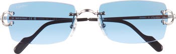 Rimless rectangular sunglasses get their glam from gleaming temples in a sleek, streamlined design.