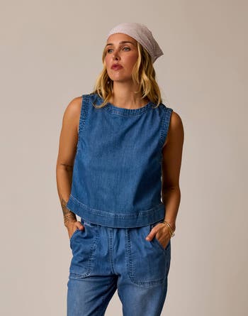 Cropped, structured tank with a back pleat and keyhole button for subtle dimension and easy wear. Crafted from lightweight denim (66% organic cotton, 27% TENCEL™ Lyocell, 6% Lycra® T400®, 1% Lycra®) for soft, breathable stretch; pairs perfectly with linen pants or high-rise denim for a polished, flattering look.