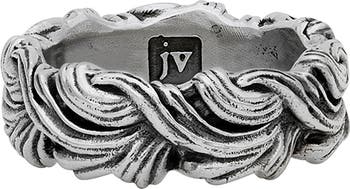 Carved waves of sterling silver wrap this artisanal band ring boasting a weathered finish.