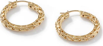 Signature carvings bring intricate texture to an everyday pair of hoop earrings handcrafted from 18-karat gold using traditional Balinese techniques.
