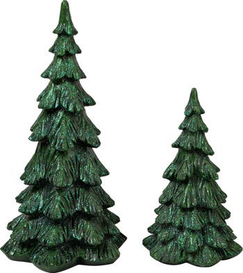 Bring festive sparkle to your holiday decor with this Set of 2 carved trees Christmas decorations. Featuring an intricate carved design coated in shimmering green glitter, these trees add a touch of elegance and seasonal charm to tabletops, mantels, and holiday displays. Product Features: Set of 2 carved pine tree decorations Lightly dusted in green glitter Solid and durable construction Recommended for indoor use only Dimensions: Large: 11.5" high x 6" in diameter (at base) Small: 7.5" high x 5" in diameter (at base) Material(s): polyresin