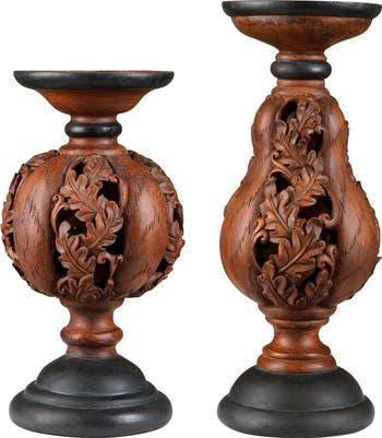 Add seasonal charm to your space with this set of 2 fall candle holders, featuring one pumpkin and one squash. Standing 10" and 8.25" tall, each piece showcases the look of carved wood with intricate leaf detailing. Perfect for mantels, tabletops, or Thanksgiving centerpieces, these decorative accents add rustic charm and cozy ambiance to your fall decor. Product Features: Look of carved wood Each holds 1 pillar candle - not included Recommended for indoor use only Dimensions: Pumpkin: 8.25" high x 4 diameter Squash: 10" high x 4" diameter Candle platform: 3" diameter Material(s): polystone