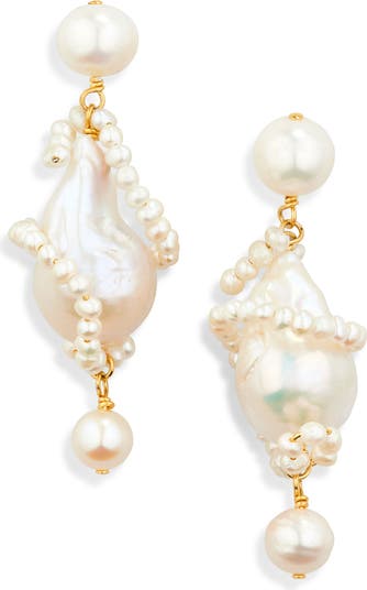 Faux pearls encircle baroque freshwater pearls in these classic-goes-modern drop earrings.