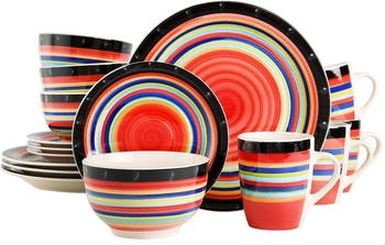 Keep your table looking stylish with the Gibson Home Casa Stellar 16 Piece Round Stoneware Dinnerware Set. This set comes with full service for four, including four dinner plates, four dessert plates, four bowls, and four mugs. The vibrant multi colored ring design is a modern take on the classic dinnerware style. This every day set is dishwasher and microwave safe for easy clean up and reheat.