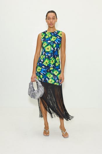 Sleeveless gown with slim and light contouring bodice. Asymmetrical hem with a dramatic and contrasting floor sweeping layer of fringe.