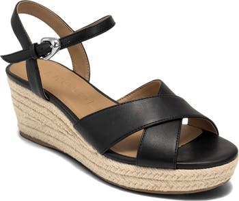 An espadrille-inspired wedge sole completes this ankle-strap sandal with just the right touch of earthy sophistication.