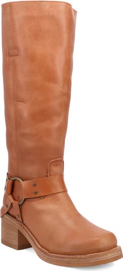 Antique studs and a rugged harness buckle bring an edgy aesthetic to a '70s-inspired boot grounded by a cushioned footbed and chunky woodgrain heel.