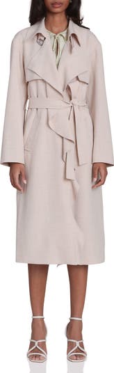 Cascading ruffles down the front put an elegant spin on this structured trench coat cinched with a matching tie belt.