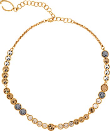 Graduated rhinestones give the illusion of movement to this golden front necklace that warms your glow.