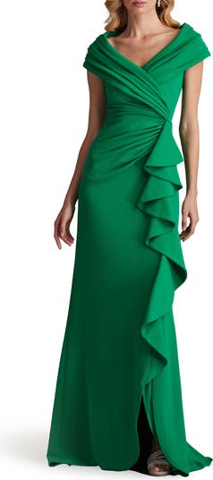 Be a verdant vision in a simply grand gown decked with a flourishing ruffle and shaped with a face-framing necklline.