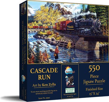 Experience the captivating world of Cascade Run with the enchanting 550-piece jigsaw puzzle brought to life by the vibrant artistry of Ken Zylla. Perfect for a peaceful solo evening or a fun-filled family gathering, be transported into the heart of Americana, complete with nostalgic charm of trains and fascinating landscapes. Assembled to 15" x 24", each piece interlocks seamlessly, owing to SunsOut's commendable precision craftsmanship. Made from durable, high-quality recycled cardboard, each puzzle piece guarantees hours of joy not just for today, but for many years to come. SunsOut's puzzles stand as an emblem of eco-friendly artistic excellence, crafted with soy-based inks and recycled boards in commitment to eco-conscious puzzling. Embrace the serenity of nature whilst caring for our planet in a unique blend of creativity and sustainability. Made proudly in the USA, SunsOut's Cascade Run puzzle supports domestic craftsmanship, ensuring the highest manufacturing standards. As a woman-owned small business, they take pride in delivering quality products and exceptional customer satisfaction, backed by a worry-free guarantee. Join in on an immersive journey through scenic beauty and beyond. Witness each story that unfolds through the art of Ken Zylla as you piece together the vibrant intricacies of a bygone era, bridging the past to the present, making for a truly timeless experience to share with friends and family. Explore Americana and embrace your puzzle-solving prowess with this Americana themed masterpiece from SunsOut.