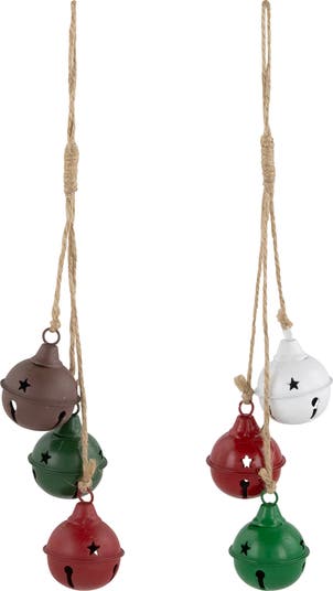 Add festive charm to your holiday decor with this set of cascading Christmas jingle bells. This set of two features multicolored bells, in matte and shiny finishes. The cascading design brings a joyful and whimsical touch to your Christmas decorations, perfect for hanging on your holiday tree. The cheerful jingle of the bells enhances the holiday spirit, creating a warm and inviting atmosphere in any space. Features: Christmas jingle bell ornaments Colors: brown, white, red, green Set of 2 in shiny and matte finish Each has 3 jingle bells Designed with star cutouts Ready to hang on a jute rope Indoor use recommended Dimensions: 13.5"H x 3"W x 2"D Material(s): metal/jute