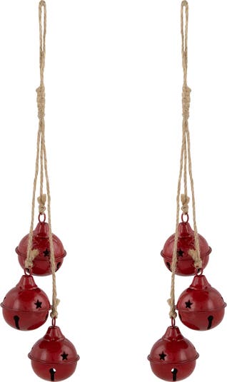 Enhance your holiday decor with this delightful set of Christmas jingle bell ornaments. Featuring a shiny finish, these bells come in a festive red hue. Suspended on a jute rope, they add a rustic yet vibrant touch to any space. Perfect for hanging on Christmas trees, these jingle bells will bring joyous cheer to your home this season. Features: Christmas jingle bell ornaments Set of 2 in a shiny red finish Each has 3 jingle bells Designed with star cutouts Ready to hang on a jute rope Display together or separately on doors and Christmas trees Indoor use recommended Dimensions: 13.5"H x 3"W x 2"D Material(s): metal/jute