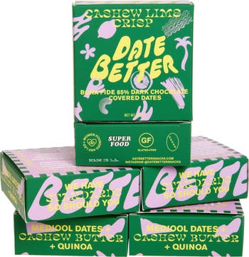 Upgrade your snacking game with chewy, stuffed Medjool dates covered in 85% dark chocolate and made with less than one gram of added sugar. Cashew Lime Crisp features a filling of the creamiest cashew butter, a speckling of crispy toasted quinoa for extra protein and a coating of organic, fair-trade 85% dark chocolate free from any soy or emulsifiers.