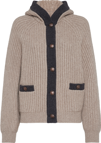 - Metal button closureDrop shoulderRaglan shoulder with balloon sleeveHoodHand pocketsRib knit