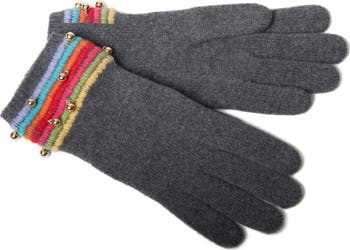 Cashmere gloves in flat jersey with beautifully crafted cuff in multicolor stripes that makes it a bracelet with hanging sewn charms
