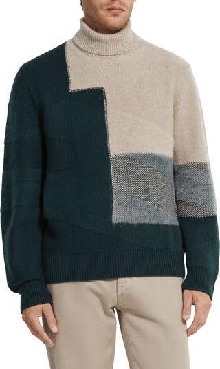 Graphic by eye yet plush in the hand, this Italian-knit sweater layers cashmere depth with airy mohair bloom. The posh turtleneck holds a gentle curve while the mixed-stitch panels shift from matte to haze with each move.