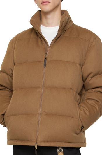 A funnel-neck puffer jacket in cashmere, brushed for a soft finish and filled with goose down and feathers. Cut to a relaxed fit, the Snowdon features a drawcord hem to adjust the shape and a Burberry Check packaway hood for unpredictable weather. The design is finished with a leather Knight stamp, an archival motif first used in the 1980s.||Two-way zip closure|Packaway drawcord hood|Side zip pockets|Drawcord hem|Storm cuffs|Leather patch with Equestrian Knight Design at sleeve|Burberry Check lining|Comes with a garment bag
