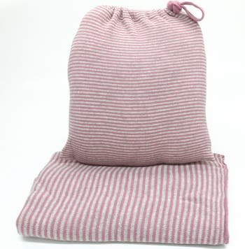 Luxurious travel set in mini stripes two tone, including a 36"x80" light weight travel blanket with rolled edges and drawstring bag that can be used as a travel pillow case.
