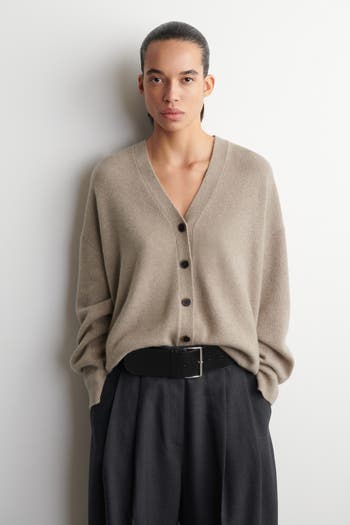 Luxuriously soft cashmere is a key tenet of the COS wardrobe. Rendered in an enduring taupe hue, this cardigan is crafted from premium Good Cashmere Standard® yarn and designed with a V-neckline, dropped shoulders, and chunky ribbed trims.