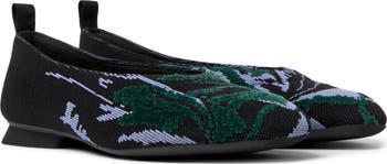A slightly squared toe brings a modern edge to this knit flat artfully decorated with a unique abstract design.
