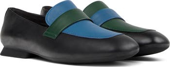 The label's signature complimentary but not identical design is displayed in colorblock leather on this playful loafer.