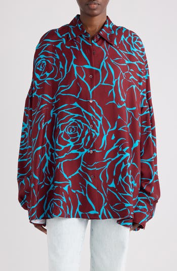 An allover woodblock print of roses writ large speaks to Van Noten's affinity for all things floral on an oversized button-up shirt elegantly framed with dropped-shoulder blouson sleeves.